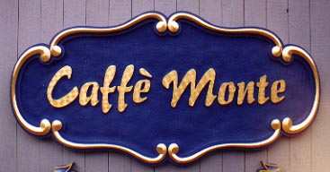 "Caffe Monte" is fabicated from high density uretahne (HDU), background is sandblasted and, the scrolls are hand carved HDU appliques. All elements are gilded with 23kt.gold leaf. A spun burnish has been applied to the lettering. | ![]() |