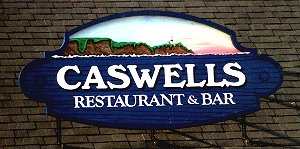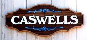 "Caswell's Restaurant and Bar" is a sandblasted sign fabricated from HDU. The mural is of a "secret" fishing spot in Montauk named "Caswell's." (Please don't tell anybody you found out about it at this website.) The cliffs were carved and hand painted with acrylics. The background sky was cut out and a mural was handpainted on 1/2" Signply mortised into the rear. The lettering and wave crests are gilded with aluminum leaf. |