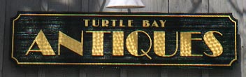 "Turtle Bay Antiques" is a sandblasted redwood sign with 23kt. gold leaf and clearcoat for added lustre and for overall protection of the finish. |