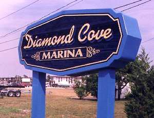 This is a double sided free standing sign made from sand blasted redwood. The lettering "Diamond Cove" is a hand shaped 3/4" High Density Urethane applique with a dropshade sandblasted into the panel. The lettering and pinstripe are gilded with 23kt. gold leaf and a hand spun burnish. | ![]() |