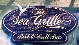 Photographed on the work bench, this sandblasted sign is made from High Density Urethane and has a hand carved seagull applique. The background has been texturized during production by our own process. |