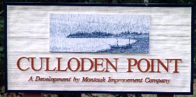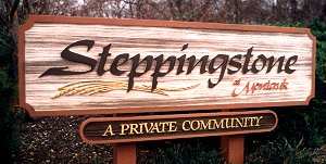 "Steppingstone at Montauk" is an entry sign for a condominium complex. It is sandblasted with hand painted lettering and 23kt. gold leaf graphic. The subsign is sandblasted with 23kt. gold leaf lettering, |