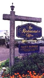 This is a 12" x 48" free standing sand blasted redwood sign. The lettering and finials (post tops) are gilded with 23kt. gold leaf. A hand spun burnish has been applied. |