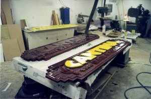 The waterbase background color has been applied and is dry. We fabricated the raised lettering by hand in our shop. The letters are meticulously prepared to to recieve gilding with 23kt. gold leaf (traditional method, not vinyl imitation). This photograph depicts the lettering undergoing a test fitting prior to gilding. |