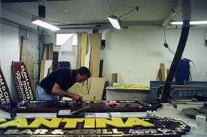 The signs are being traditionally gilded in this photograph. When the gilding is complete it is inspected for holidays. A hand spun burnish is applied to achieve mazimum lustre causing light to reflect from the gold surface in many angles. This is a very popular design element. |